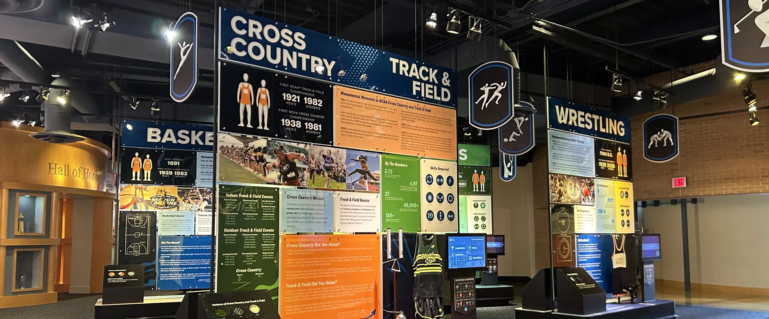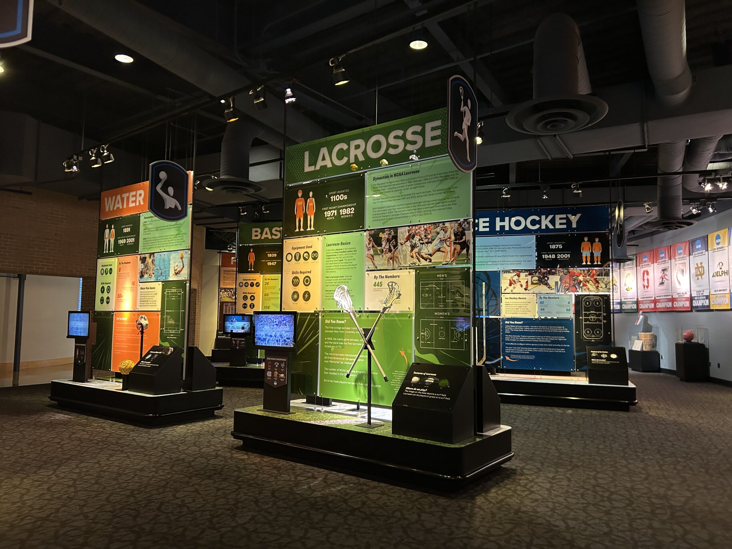 The renovated NCAA® Hall of Champions Museum features high ceilings, tall windows, architectural nuances, dramatic lighting, interactive exhibits, and both auditorium and conference-room spaces.